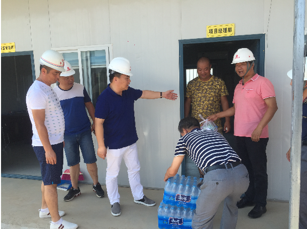 “現(xiàn)在天氣炎熱,大家要注意高溫施工安全,做好防暑降溫工作!”每到一處,公司總經(jīng)理和副總就耐心跟施工現(xiàn)場人員叮囑一番,同時要求相關(guān)負(fù)責(zé)人千方百計(jì)做好員工的后勤保障工作,加強(qiáng)對飲用水、食品和工地食堂衛(wèi)生管理,確保一線人員身體健康。慰問組人員親手把礦泉水、藥品等防暑降溫用品送到施工現(xiàn)場人員手上,施工現(xiàn)場負(fù)責(zé)人一致表示,將按照集團(tuán)公司領(lǐng)導(dǎo)的要求,認(rèn)真做好施工現(xiàn)場防暑降溫工作和安全生產(chǎn)工作,保證工程各項(xiàng)工作的順利開展。
