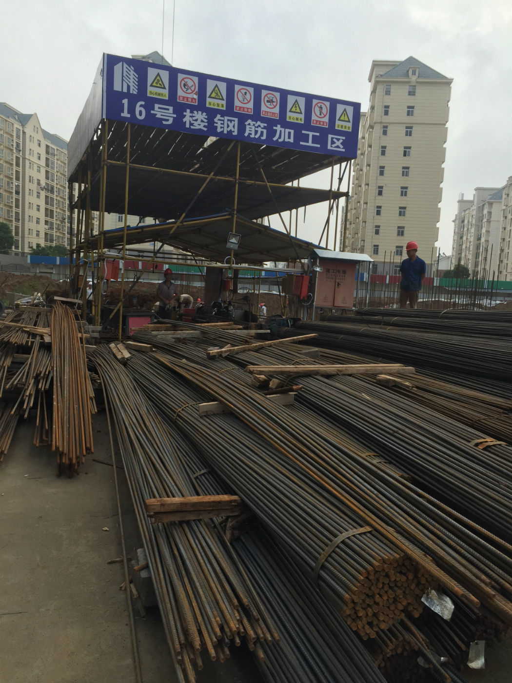 進(jìn)入大門,工地上呈現(xiàn)熱火朝天、一片繁忙的景象,首先映入眼簾的是鋼筋加工棚里鋼筋堆放整齊,操作間機(jī)械設(shè)備都采取了相應(yīng)的防護(hù)措施,施工場(chǎng)地經(jīng)過通道硬化處理,外側(cè)排水溝施行有組織排水,道路排水通暢,工地?zé)o積水現(xiàn)象。材料堆放區(qū)搭設(shè)有工棚,各種成品、半成品及周轉(zhuǎn)材料的堆放井然有序,并做了相應(yīng)的原材料保護(hù)措施。