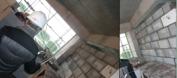 邁入三樓,王工更是拿出尺子,用精細(xì)的數(shù)據(jù)去檢驗(yàn)工程的品質(zhì),他仔細(xì)測量了磚砌體頂部斜砌留置位置的大小,角度,認(rèn)真向大家介紹了磚砌體施工要求以及不規(guī)范施工帶來的后果,并對16號樓規(guī)范的磚砌體作業(yè)予以高度評價,16號樓磚砌體灰縫均勻、順直、密實(shí),基礎(chǔ)處理較好;拖墻筋植筋合規(guī);頂部斜砌留置合規(guī);墻體觀感度良好,整體質(zhì)量優(yōu)良!