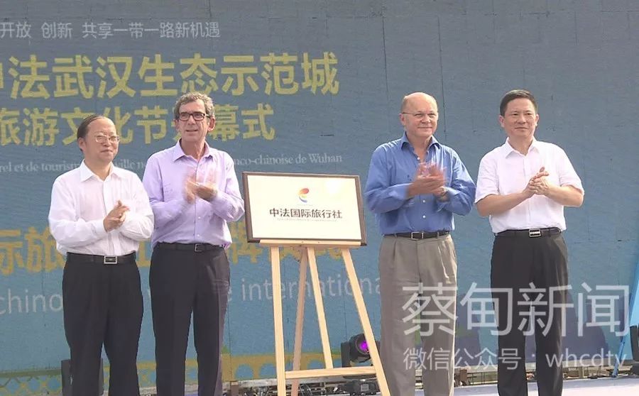 法國駐華大使黎想、法國生態(tài)與團結(jié)化轉(zhuǎn)型部城市可持續(xù)發(fā)展協(xié)調(diào)人克里斯汀?樂維、副市長龍良文、蔡甸區(qū)委書記、中法武漢生態(tài)示范城管委會主任劉子清共同為“中法國際旅行社”揭牌。