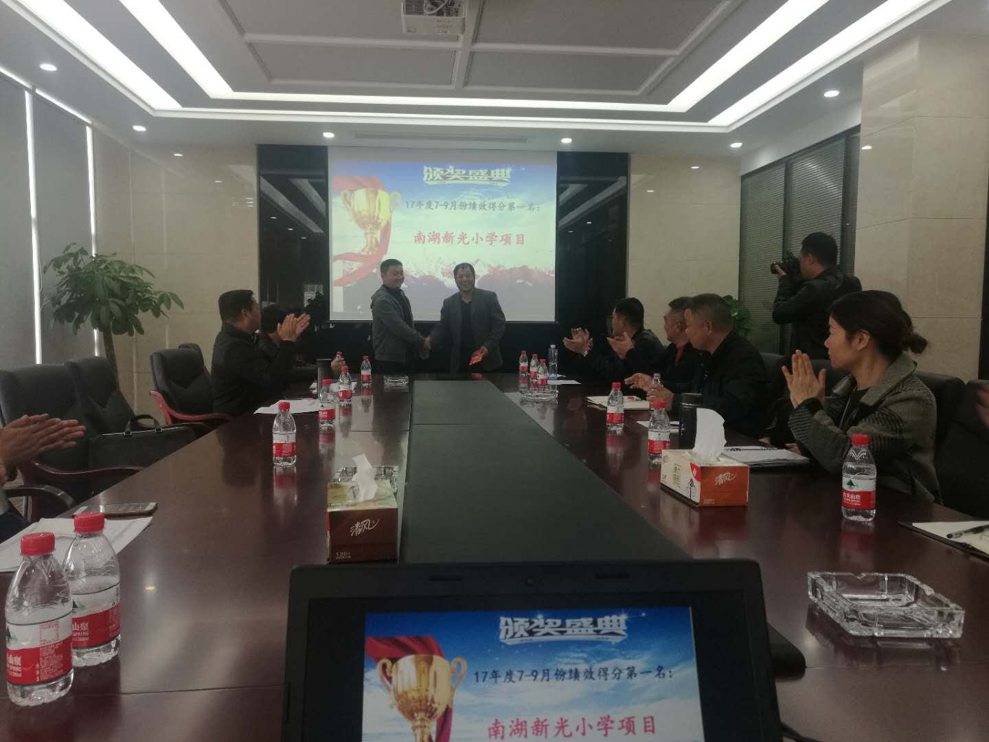 會議開始,由人事行政部公布了上季度績效考評中的冠軍項目——南湖(新光)小學(xué)項目,并由董事長徐濤向冠軍項目頒發(fā)10000元獎金!