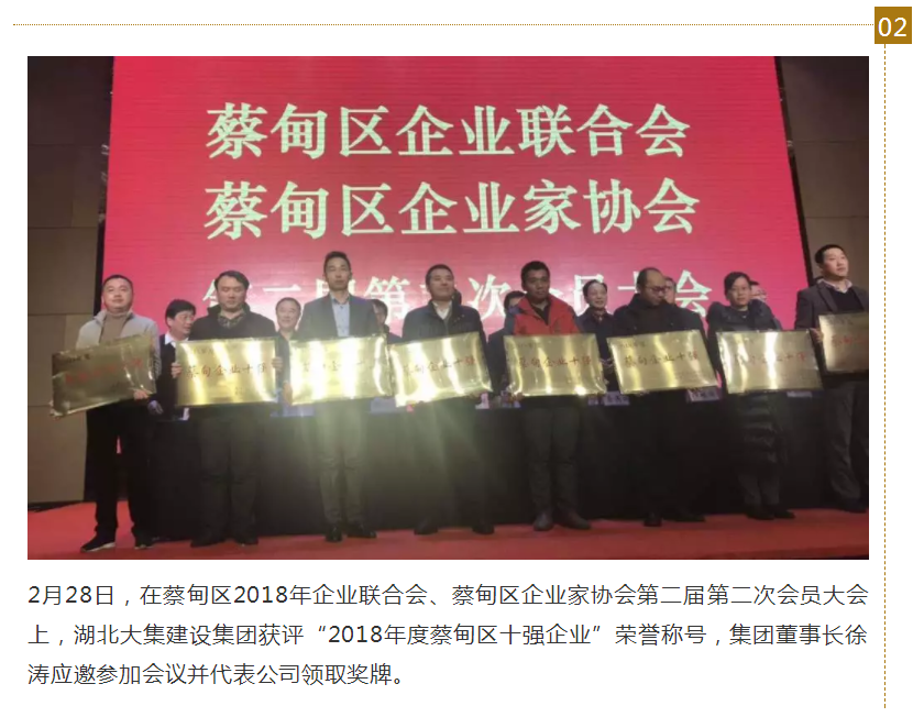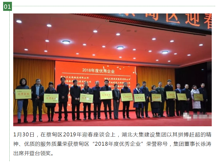 近日,集團公司接連受到蔡甸區(qū)人民政府、蔡甸區(qū)企業(yè)聯(lián)合會的表彰,分別榮獲“2018年度優(yōu)秀企業(yè)”和“2018年度蔡甸企業(yè)十強”的榮譽稱號,這些榮譽的獲得充分展現(xiàn)了集團公司在依法納稅、優(yōu)質(zhì)工程創(chuàng)建、安全文明生產(chǎn)、信用評價等方面的硬功夫,彰顯了湖北大集建設(shè)集團的品牌形象與綜合實力。