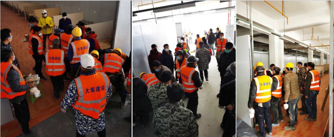 門外大雪紛飛,冰天雪地,屋內(nèi)緊張激烈,熱火朝天!針對人員不足、主材緊缺,施工隊(duì)伍難以調(diào)集,工期短,要求高,難度大等問題,董事長徐濤當(dāng)機(jī)立斷,現(xiàn)場成立施工指揮部,由他親任總指揮,項(xiàng)目經(jīng)理周偉任副總指揮,周勝書任施工總負(fù)責(zé),統(tǒng)籌現(xiàn)場大小事宜;張?bào)摇⑴嵝谐?、徐駿、汪勇、周峰、王洪波等項(xiàng)目經(jīng)理全體上陣,大家分工合作,細(xì)化施工圖紙,統(tǒng)籌施工組織,迅速形成一條集人員調(diào)配,材料供應(yīng),運(yùn)輸保障,后勤服務(wù),財(cái)務(wù)支援等無縫對接的閉環(huán)作戰(zhàn)鏈條,大家相互支援,齊心協(xié)力,當(dāng)天便迅速組織起了包括泥工、木工、水電工、搬運(yùn)、雜工等在內(nèi)的兩百多人的施工團(tuán)隊(duì),大量主材、輔料也陸續(xù)到位,各項(xiàng)工作開始緊張有序地開展,短短五天時(shí)間,湖北大集建設(shè)集團(tuán)便圓滿完成施工任務(wù),為區(qū)指揮部交上一份完美的答卷,也向社會(huì)展示了公司專注、專業(yè)的大集速度!