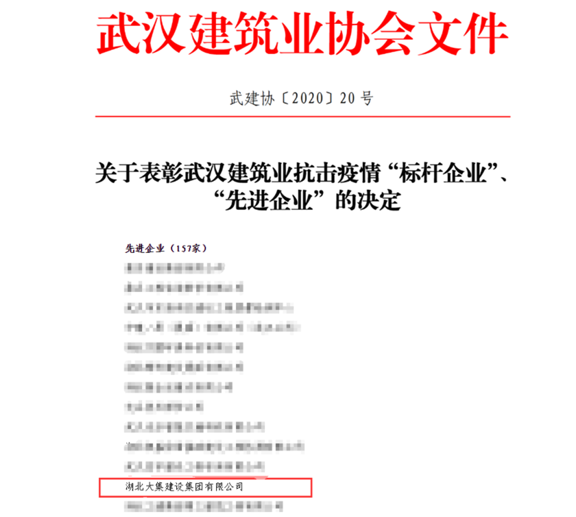 4月14日,武漢建筑業(yè)協(xié)會(huì)發(fā)布《武建協(xié)〔2020〕20 號(hào)——關(guān)于表彰武漢建筑業(yè)抗擊疫情“標(biāo)桿企業(yè)”、“先進(jìn)企業(yè)”的決定》,對(duì)在抗疫“主戰(zhàn)場(chǎng)”積極擔(dān)責(zé),奮不顧身、盡銳出戰(zhàn),與死神賽跑、與疫魔競(jìng)速的27家武漢建筑業(yè)“標(biāo)桿企業(yè)”、157家“先進(jìn)企業(yè)”進(jìn)行表彰。湖北大集建設(shè)集團(tuán)因在抗疫過程中主動(dòng)作為、勇于擔(dān)當(dāng),獲評(píng)“先進(jìn)企業(yè)”榮譽(yù)稱號(hào)。