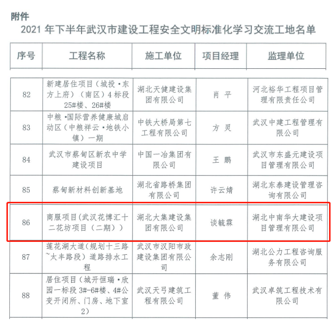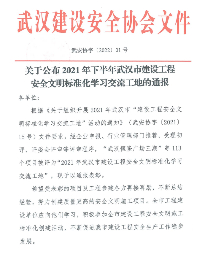 此次獲評“2021年下半年武漢市建設(shè)工程安全文明標(biāo)準(zhǔn)化學(xué)習(xí)交流工地” 稱號,不僅是對武漢花博匯十二花坊項目部(二期)安全管理和文明建設(shè)水平的肯定,也有力彰顯了公司企業(yè)形象,希望其他項目能多向做得好的項目學(xué)習(xí),做到高標(biāo)準(zhǔn),嚴(yán)要求,做品牌項目,打造公司口碑,將項目做成標(biāo)準(zhǔn)示范工程!