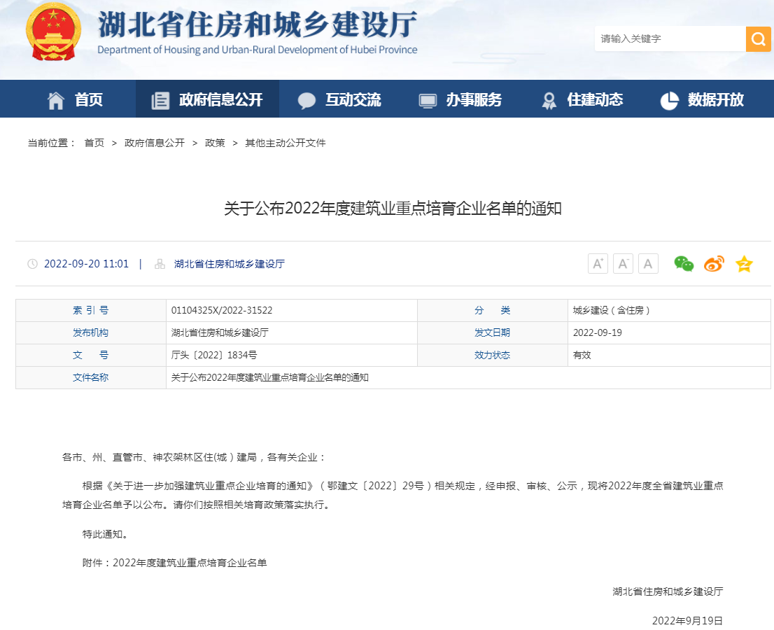 920日,湖北省住房和城鄉(xiāng)建設(shè)廳網(wǎng)正式公布湖北省2022年度建筑業(yè)重點(diǎn)培育企業(yè)名單,湖北大集建設(shè)集團(tuán)成功入選!