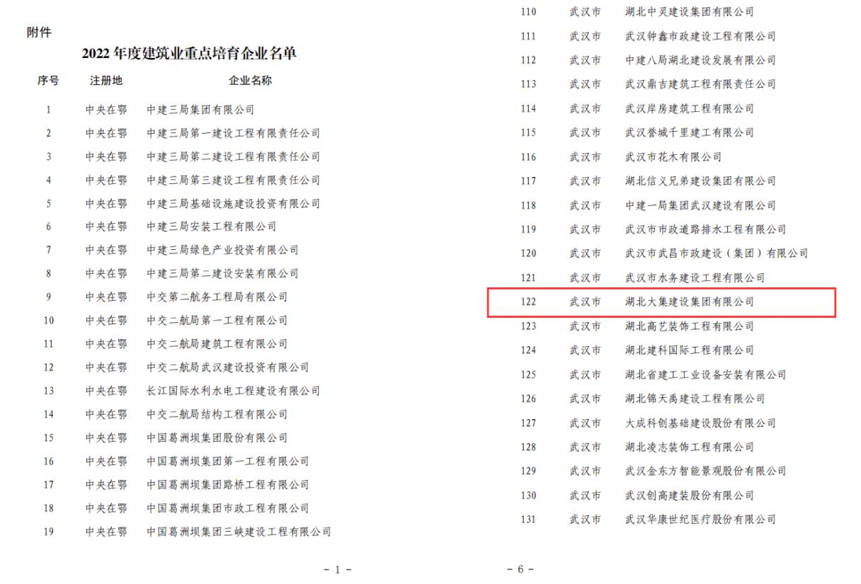喜訊!湖北大集建設(shè)集團(tuán)入選湖北省建筑業(yè)重點(diǎn)培育企業(yè)名單